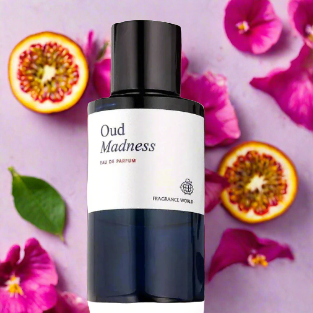 Oud Madness by Fragrance World: Luxurious Oud Fragrance. An intoxicating blend of exotic fruits, rich oud, and warm, sensual notes. Perfect for those seeking sophisticated and bold elegance.